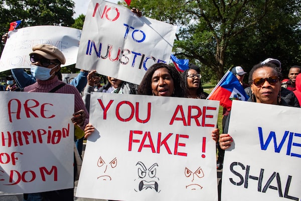 Haitian Americans and their allies in Boston pushed back at Mr. Trump on Sept. 24 after the debate where he claimed, falsely, that migrants in Ohio were eating pets.JOSEPH PREZIOSO/AFP via Getty Images